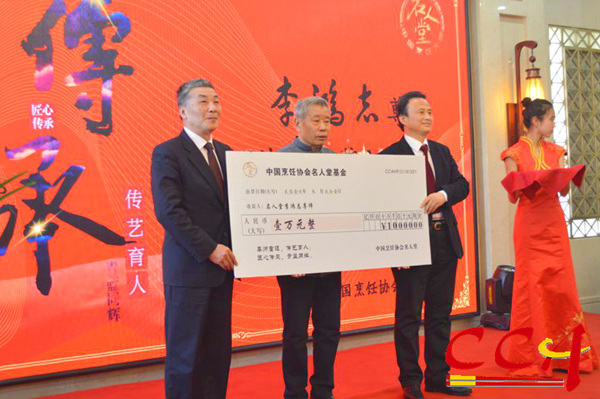 為感謝李鴻志為烹飪行業(yè)師徒傳承做出的巨大貢獻(xiàn),中國烹飪協(xié)會(huì)喬杰副會(huì)長及中國烹飪協(xié)會(huì)名人堂李春祥秘書長為李鴻志頒發(fā)了名人堂傳承基金。