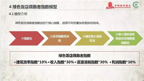 報告建立了“綠色飯店領跑者指數(shù)模型”,將為綠色飯店實現(xiàn)運營層面短期目標及資產(chǎn)層面長遠目標起到指導性作用。綠色飯店領跑者模型在設計方面,采用多層次指標體系,充分考慮了酒店在建筑效率、收入創(chuàng)造、利潤實現(xiàn)、資源消耗等四大方面的發(fā)展情況。通過四大核心指標、18個單項指標,該模型全面系統(tǒng)地反映出綠色飯店在建筑設計環(huán)節(jié)的效率性、在運營效率方面是否存在提升空間、以及在資源消耗方面是否存在問題,從而形成具前瞻性的運營監(jiān)督,實現(xiàn)最大化現(xiàn)金流增長,實現(xiàn)短期盈利目標,進而通過高效的業(yè)績優(yōu)化方案,為酒店創(chuàng)造新的增長動力,實現(xiàn)長期可持續(xù)發(fā)展目標。